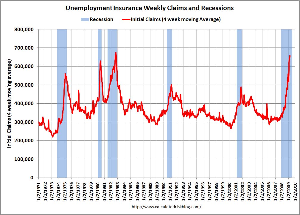 Below is a chart and also a link to a blog entry and supporting articles on the topic. This chart shows the four-week average of initial unemployment claims going back to 1971. The greyish-blue areas on the chart show the recessions. You can see very clearly how the peak occurs and then shortly thereafter the recession ends.